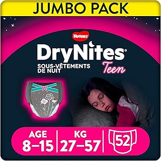 Huggies DryNites, Sous-vêtements de nuit absorbants jetables, Pour filles, Taille : 8-15 ans, 52 culottes