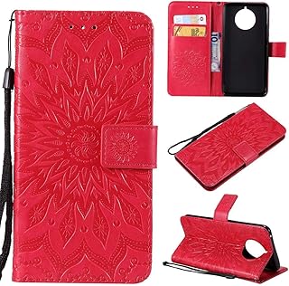 Sangrl Coque pour Nokia 9 PureView, Premium Housse en PU Cuir [Fonction Support] [Titulaire de la Carte] Motif de Fleur de Soleil en Relief Flip Case Rouge