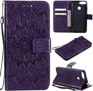 Sangrl Coque pour Honor 7C/Enjoy 8/Y7 Prime 2018/Y7 Pro 2018/Nova 2 Lite, Premium Housse en PU Cuir [Fonction Support] [Titulaire de la Carte] Motif de Fleur de Soleil en Relief Flip Case Violet