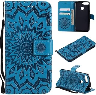 Sangrl Coque pour Honor 7C/Enjoy 8/Y7 Prime 2018/Y7 Pro 2018/Nova 2 Lite, Premium Housse en PU Cuir [Fonction Support] [Titulaire de la Carte] Motif de Fleur de Soleil en Relief Flip Case Bleu