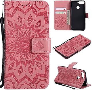 Sangrl Coque pour Honor 7C/Enjoy 8/Y7 Prime 2018/Y7 Pro 2018/Nova 2 Lite, Premium Housse en PU Cuir [Fonction Support] [Titulaire de la Carte] Motif de Fleur de Soleil en Relief Flip Case Rose