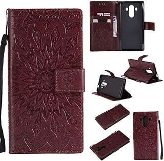 Sangrl Coque pour Huawei Mate 10 Pro, Premium Housse en PU Cuir [Fonction Support] [Titulaire de la Carte] Motif de Fleur de Soleil en Relief Flip Case Marron