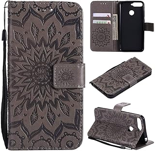 Sangrl Coque pour Honor 7C/Enjoy 8/Y7 Prime 2018/Y7 Pro 2018/Nova 2 Lite, Premium Housse en PU Cuir [Fonction Support] [Titulaire de la Carte] Motif de Fleur de Soleil en Relief Flip Case Gris