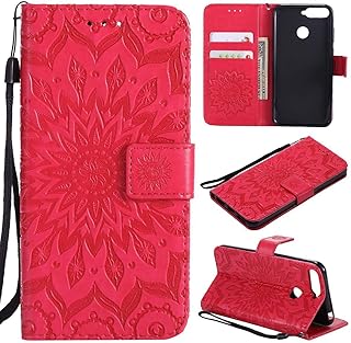 Sangrl Coque pour Honor 7C/Enjoy 8/Y7 Prime 2018/Y7 Pro 2018/Nova 2 Lite, Premium Housse en PU Cuir [Fonction Support] [Titulaire de la Carte] Motif de Fleur de Soleil en Relief Flip Case Rouge